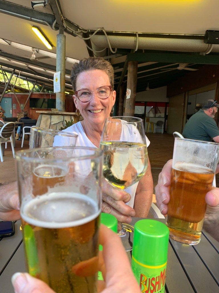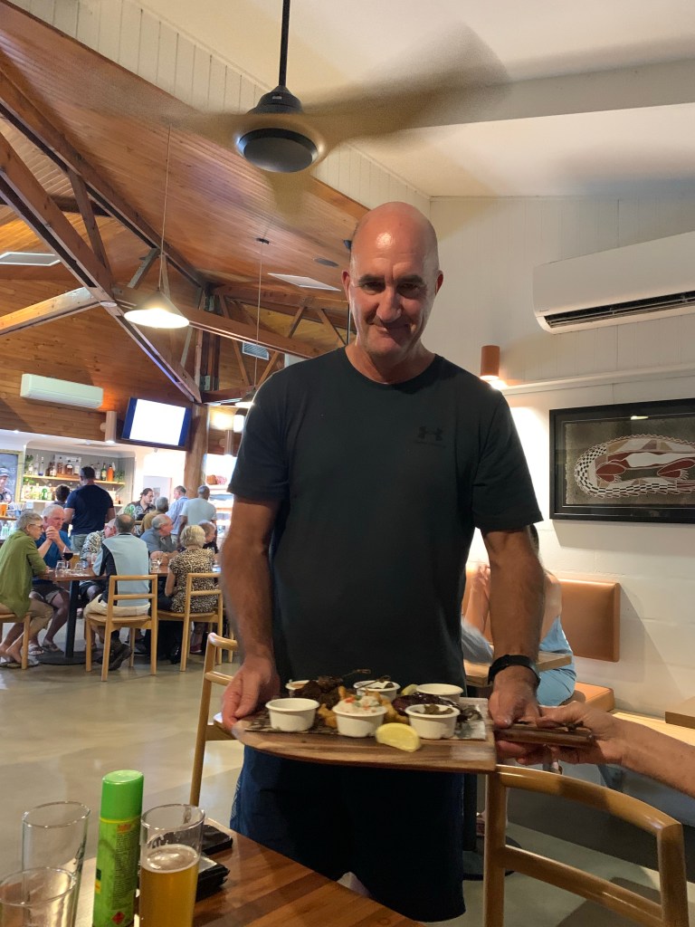 Dinner could have been a bit of a fiasco. We decided to eat in the restaurant and ordered two $58 shared platters of crocodile, kangaroo, buffalo and barramundi. Despite being in a restaurant, we had to pick up our meals. We knew there were problems when Mark and Wayne returned wth just one. Mark had dropped his, much to all the other patrons’ amusement. We think this is a regular occurrence as it was easily replaced.