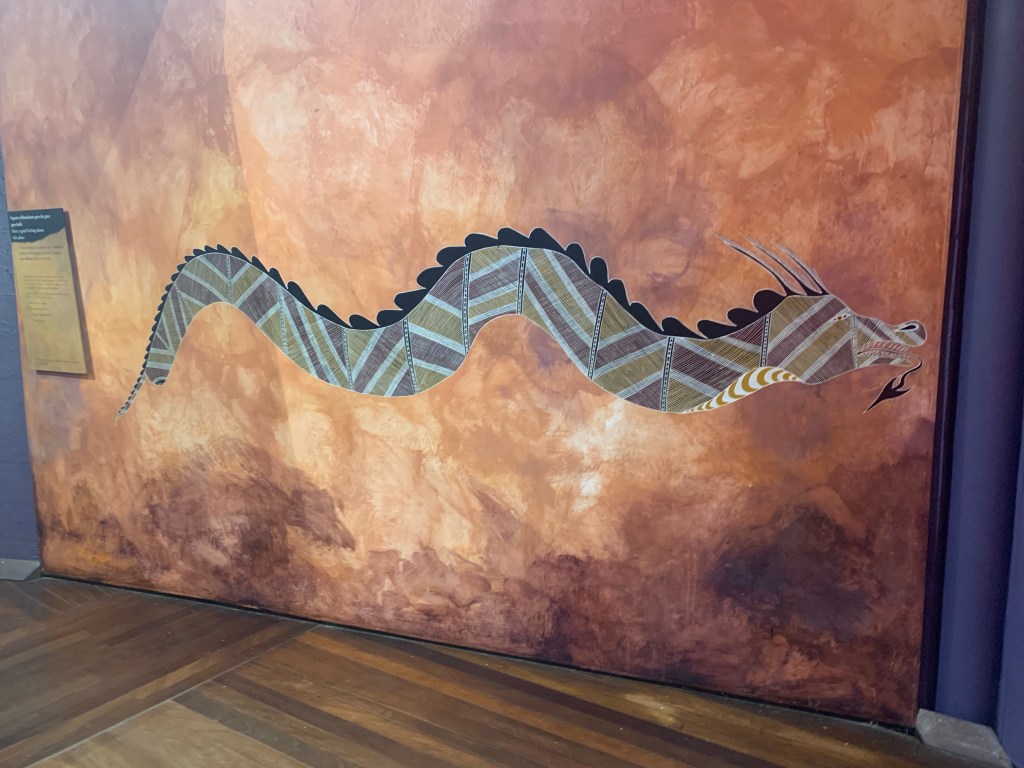 Because of his height, Mark was commandeered by the lone worker to help hang a set of buffalo horns. In return, the guy regaled a number of the Dreaming stories. The same guy told Donna she had a beautiful aura and he told her the story of why only men can play the didgeridoo (a little R-rated). Mark was convinced that the guy was trying to pick up Donna.
