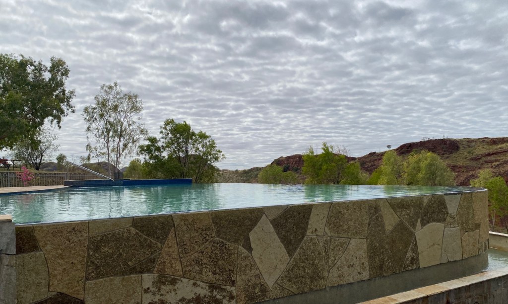 We stopped in at the caravan park with one of the world’s best infinity pools. We tried to get morning tea and buy some merch. but a tour group arrived and the staff was slammed. We did get photos of the pool and view.