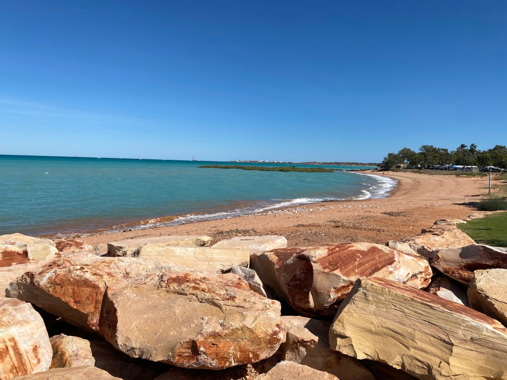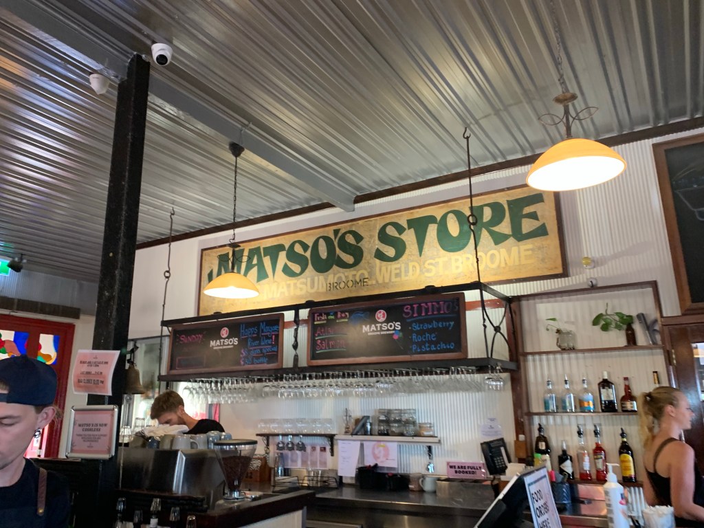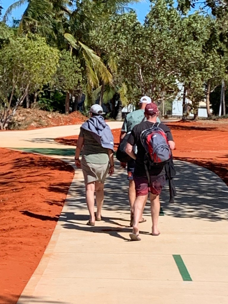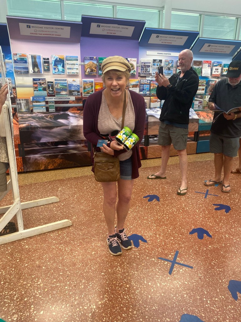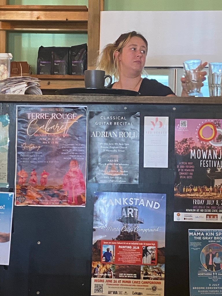 We walked a bit around Broome and found Matso’s where we had lunch. As we were leaving, Wayne missed the last step and fell heavily. He tumbled beautifully and jumped up saying, ‘I am a panther!’ He does now have a sore shoulder to add to his hay fever.
