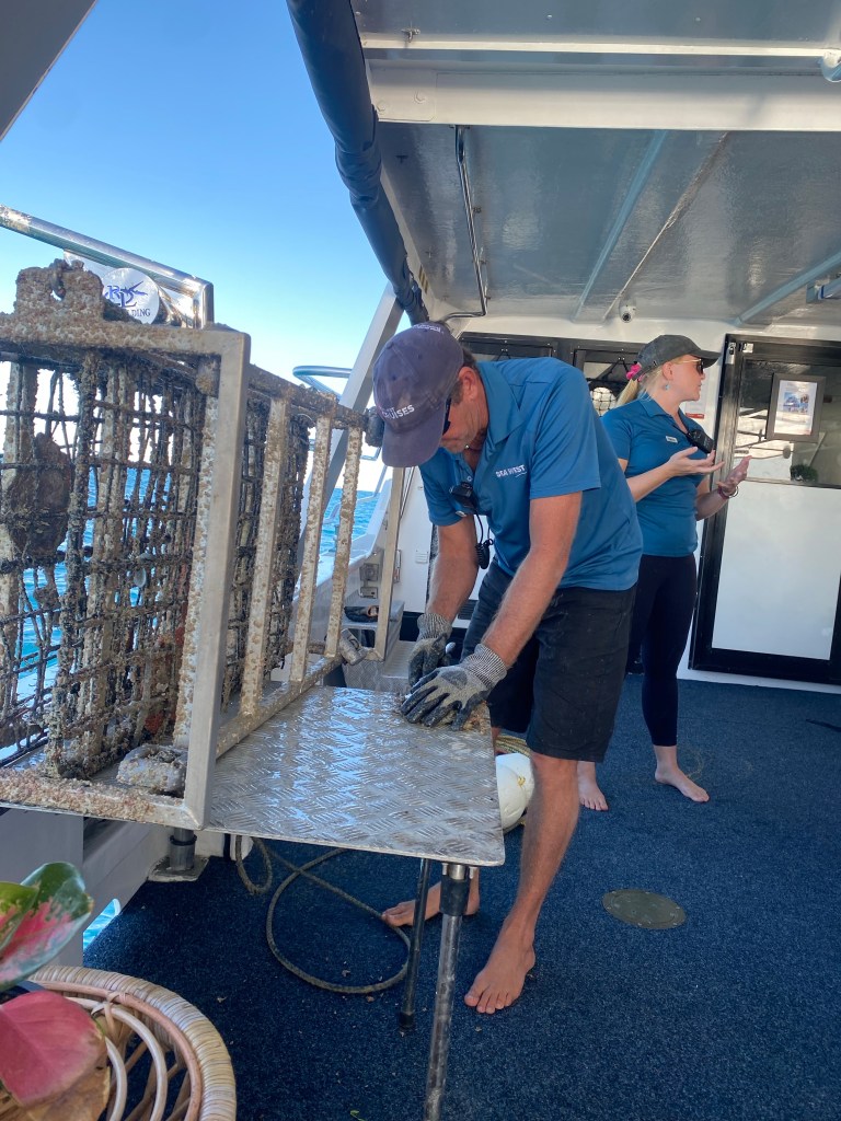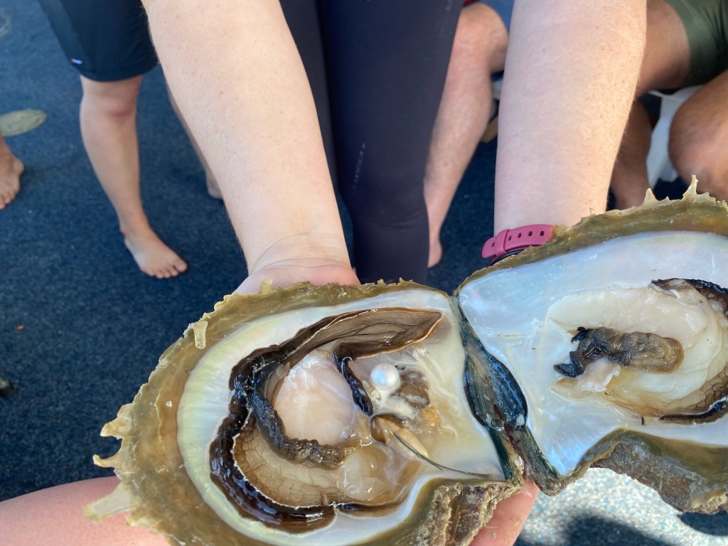 A rack of Mother of Pearl oysters was pulled up and Donna selected the first one to open. No pearl in this one but we were given a taste of its meat. The second one had a magnificent pearl.